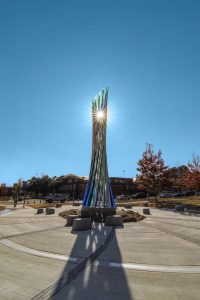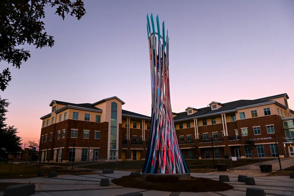 Now, artist Curtis Pittman imagines the lady’s next-of-kin has come to campus. He calls his newly installed, 45-foot-tall sculpture Aspire. Bolted in place on November 11, 2021, the sculpture sits amidst a grove of noble oak trees, which has been planted between Keeny Hall and the College of Business by landscape architects CARBO. Aspire is funded by of Louisiana’s Percent for Art program, which requires state construction projects costing $2 million or greater to reserve one percent of funds for the acquisition and installation of art.