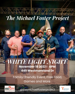 We always enjoy our Mid City Baton Rouge location and its proximity to restaurants, shops, and parks. But it’s particularly prime during Mid City Merchants’ White Light Night, when the whole city comes out to enjoy Government Street. This year, we’re partnering with our friends at Mid City Redevelopment Alliance for a block party. The festivities will extend out of our office, into the courtyard and up and down Westmoreland Dr., where arts vendors and food trucks will set up shop. Expect free food and wine as well as yard games. The Michael Foster Project, brass band extraordinaire, will heat things up on this chilly night. Listen here to get in the spirit.