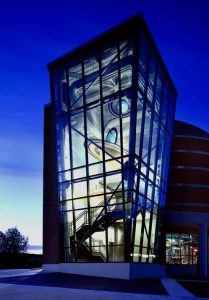 Planet Tower: The planet tower interior functions as a circulation stairway that orbits the suspended planets, allowing visitors to gain a sense of the planets’ scale and proportions. As patrons exit the space theater, their path is laced through this solar system and down an open stairway bringing all within arm’s length of the planets. Each planet model is scaled in relationship to the 60 foot planetarium roof dome representing the sun.